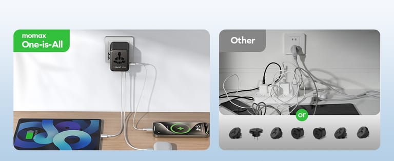 WORLDWIDE TRAVEL ADAPTER - MOMAX UA31 universal power adapter features 4 plug types (Type C/A/G/I) compatible with the 13 socket types of 200+ countries and regions across Europe, Asia, the USA and Australia. This means that a tiny adapter can solve all the problems of converting plugs during your journey. (excluding South Africa, India)