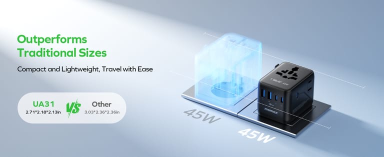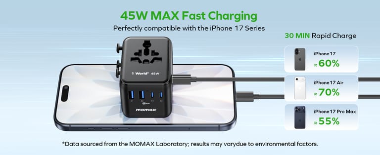 OPTIMIZED FOR IPHONE 16-17 SERIES - 45W quickly powers up your iPhone 16-17 Series from 0 to 57% in just 30 minutes. Thanks to the Advanced Stacking & GaN technology for massive power in a mini body, while adding more ports, speeding up charging and reducing temperatures. This international plug adapter saves space in your suitcase and handbag, whether navigating European or Asian cities