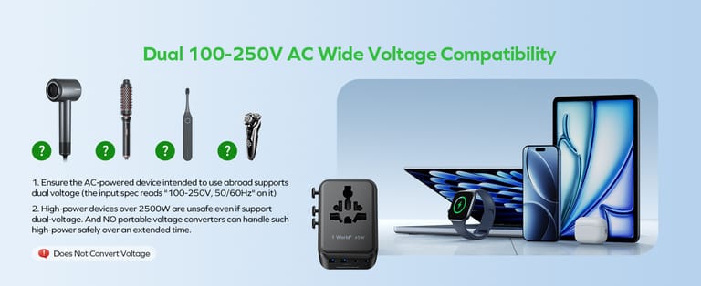 NOTE - Check specs before travel!!! This travel power adapter rated 100-250V, 50/60Hz—max 1100W (110V) or 2500W (250V). Ensure the AC-powered device intended to be used abroad supports dual voltage (the input spec reads “100-250V, 50/60Hz” on it). [Warning:] High-power devices over 2500W are unsafe even if dual-voltage, and no portable converter can safely sustain such loads long-term.